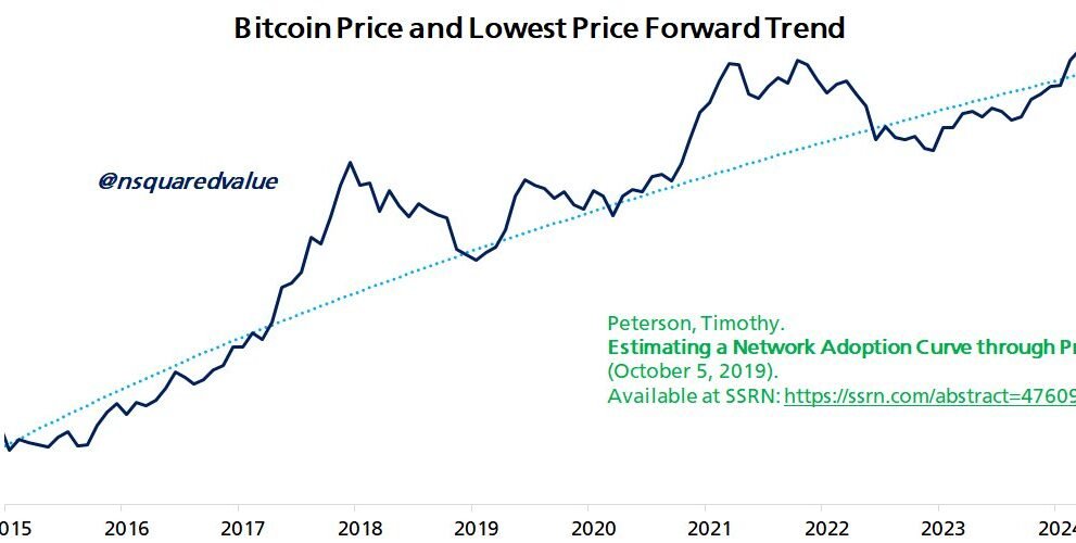 Peterson, known for his works including “Metcalfe’s Law as a Model for Bitcoin’s Value,” bases his forecast on the analytical framework detailed in his research paper titled “Lowest Price Forward: Why Bitcoin’s Price is Never Looking Back.” This paper, first published in 2019 and subsequently revised, introduces an innovative approach to understanding the Bitcoin price trajectory by focusing on its historical lowest prices, referred to as the “Never Look Back Price” (NLB). This NLB marks the last instance Bitcoin was traded at a particular price point, after which it never declined to that level again.